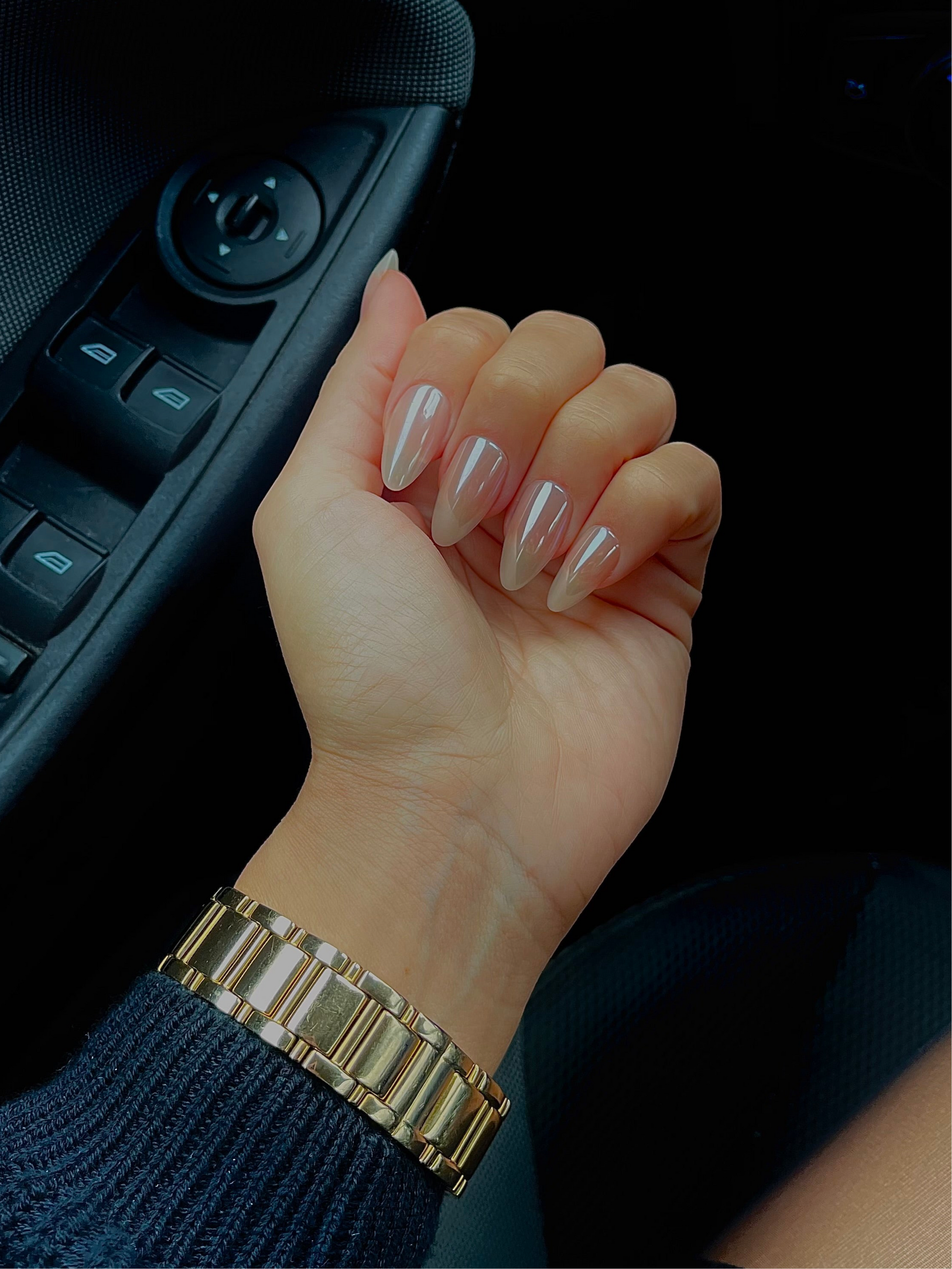 Experience the enviable shine of celebrities' iconic manicure with our Glazed Donut set. These medium-almond nails feature a sheer chrome finish, making them as sweet and shiny as can be.
