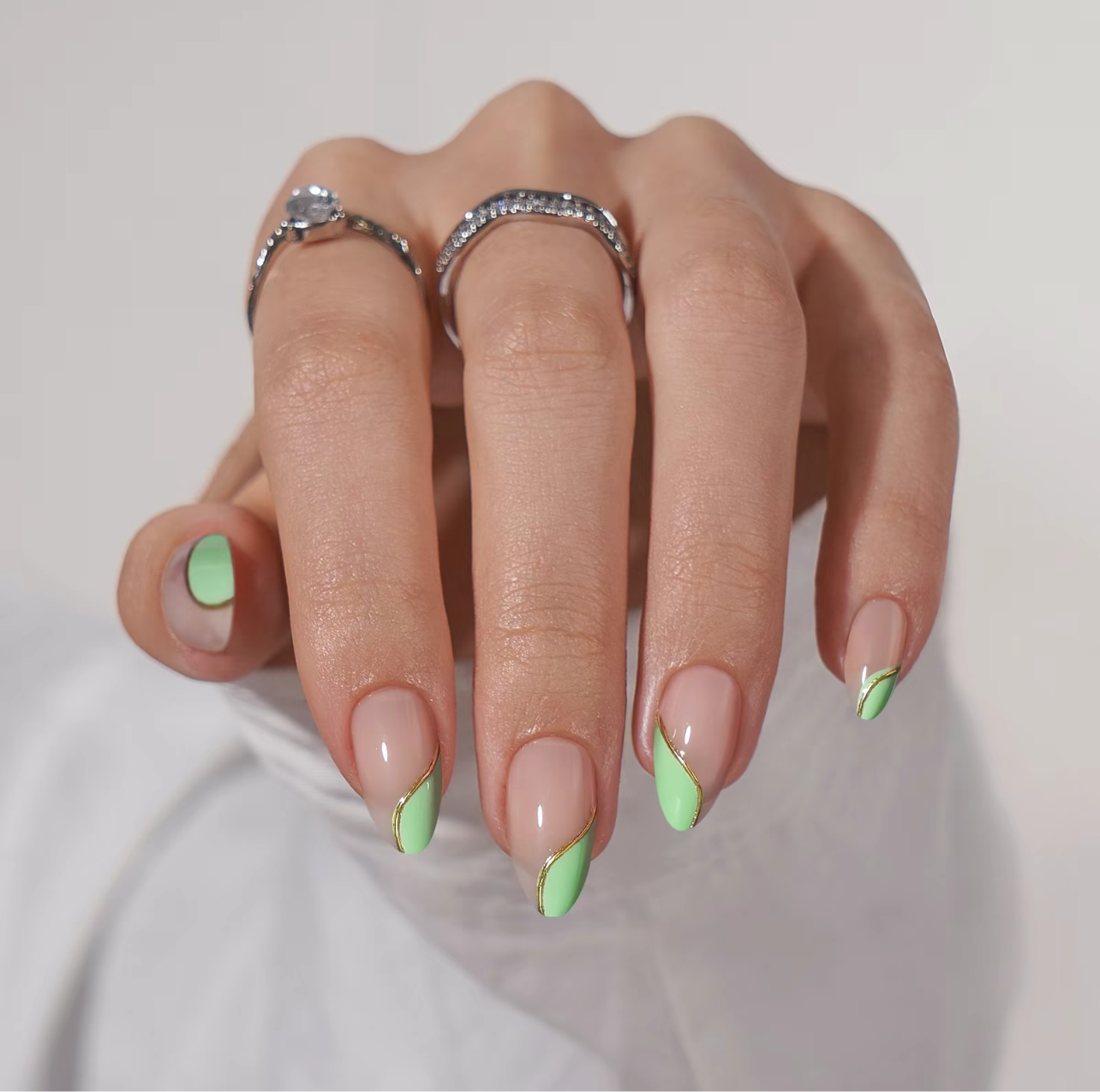 Fresh, colorful and fun! Meet Lucky Charm —our short almond nail with a transparent nude base (great for all skin tones), complemented by a spritely mint-green tip, outlined with a luxe 3D gold detail that wraps around the wavy edges. These nails are quick and easy to apply and remove, giving you a polished, salon-quality look without the wait. This colorful set is sure to make you stand out and let you embrace your playful spirit!